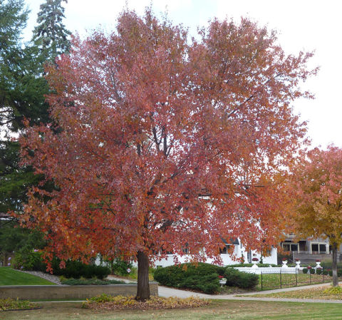 Red maple is a moderate sized tree. The leaves turn bright red in the fall. Red maple is a very hardy and adaptable tree, and can be found anywhere from swamps to dry, rocky ridges. Growth depends on site quality, with trees tending to grow much larger on moist sites with full sun. Like most maple species in Minnesota, red maple is vulnerable to cold weather damage, especially if planted in open spaces, but is very hardy to damage. Trees have a wide crown when given ample growing space but tend to be narrower in dense woods.